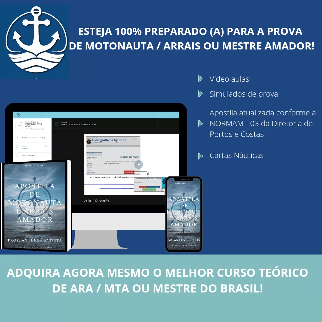 Os nossos cursos são compostos de vídeo aulas, apostila, exercícios de fixação, fichas de complementações, cartas náuticas para download, explicações para você fazer a inscrição pessoalmente na Marinha.